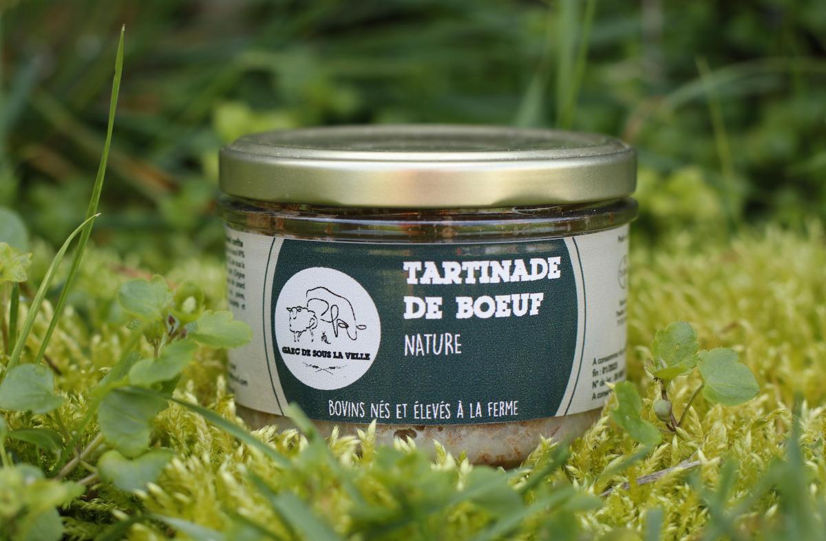 Ingrédients : viande de boeuf 49% (Origine France, GAEC de sous la Velle), gorge de porc (Origine France), eau, graisse de Canard (origine France), sel, poivre, muscade, thym, ciboulette et persil déshydratés.